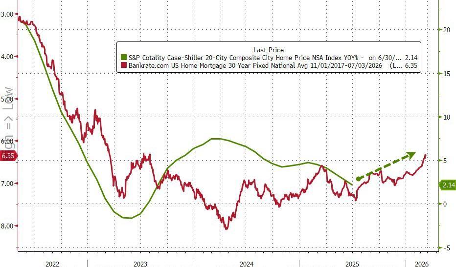 Home prices across the top 20 cities in the US fell by 0.07% MoM (less than the 0.2% decline expected) - the fifth straight monthly drop in prices. This pulled the YoY price appreciation down to 1.82%, the lowest since July 2023...