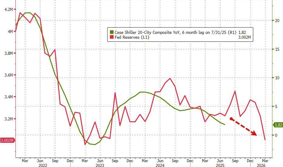 But, home price changes do seem to track very closely with bank reserves at The Fed (6mo lag), which implies home prices could rapidly decelerate in the new year (after a brief rebound)...