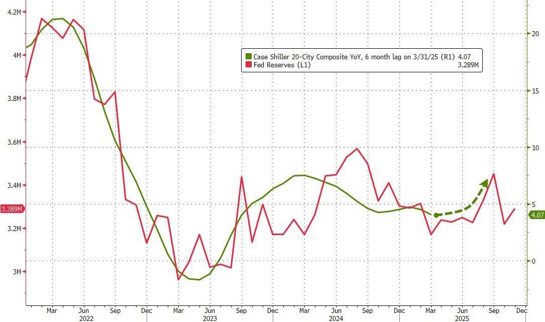 However, home price appreciation does seem to track very closely with bank reserves at The Fed (6mo lag), which implies prices are going continue to lag for the next couple of months before re-accelerating once again...