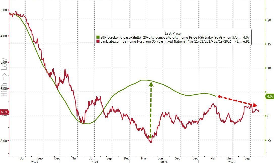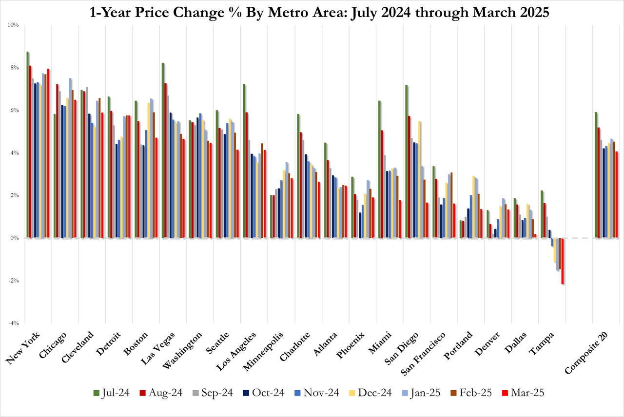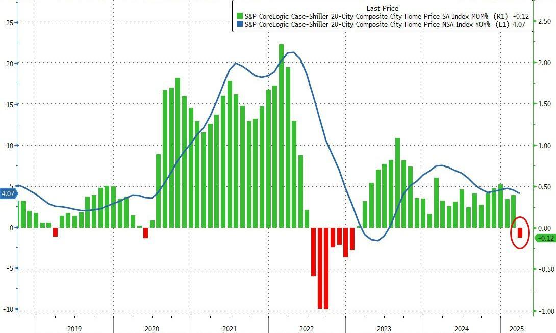 For the first time since January 2023, US Home Prices, according to S&P CoreLogic Case-Shiller's 20-City Composite Index, fell (-0.12% MoM) in March (the latest data available). That dragged the YoY change in home price down to +4.07%, the lowest since August 2023