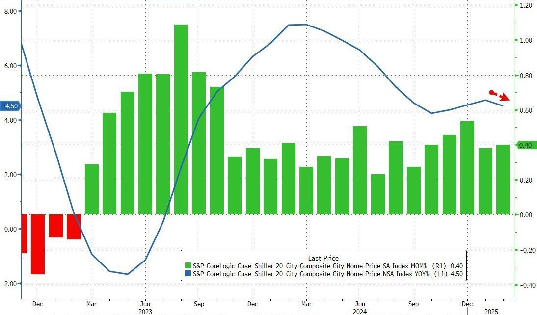 US home prices hit a new record high in February, according to the latest data from S&P CoreLogic Case-Shiller, rising 0.4% MoM (as expected). However, the pace of price rises did slow modestly (after accelerating for the past three months) to +4.50% YoY...