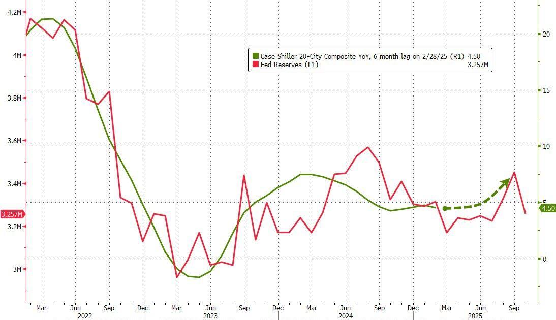However, home price appreciation does seem to track very closely with bank reserves at The Fed (6mo lag), which implies prices are going continue to lag for the next couple of months before re-accelerating once again...