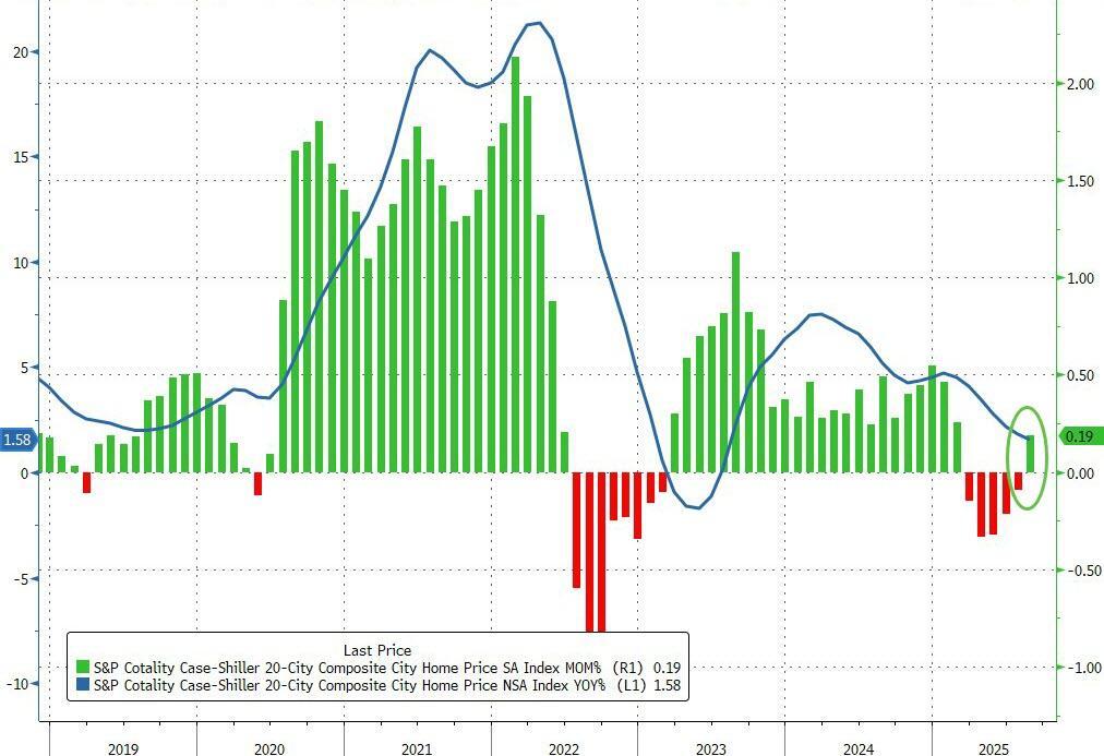 After five straight months of MoM declines, S&P Case-Shiller reports that home prices in America's 20 largest cities surged 0.19% MoM (far better than then -0.10% MoM expected)...
