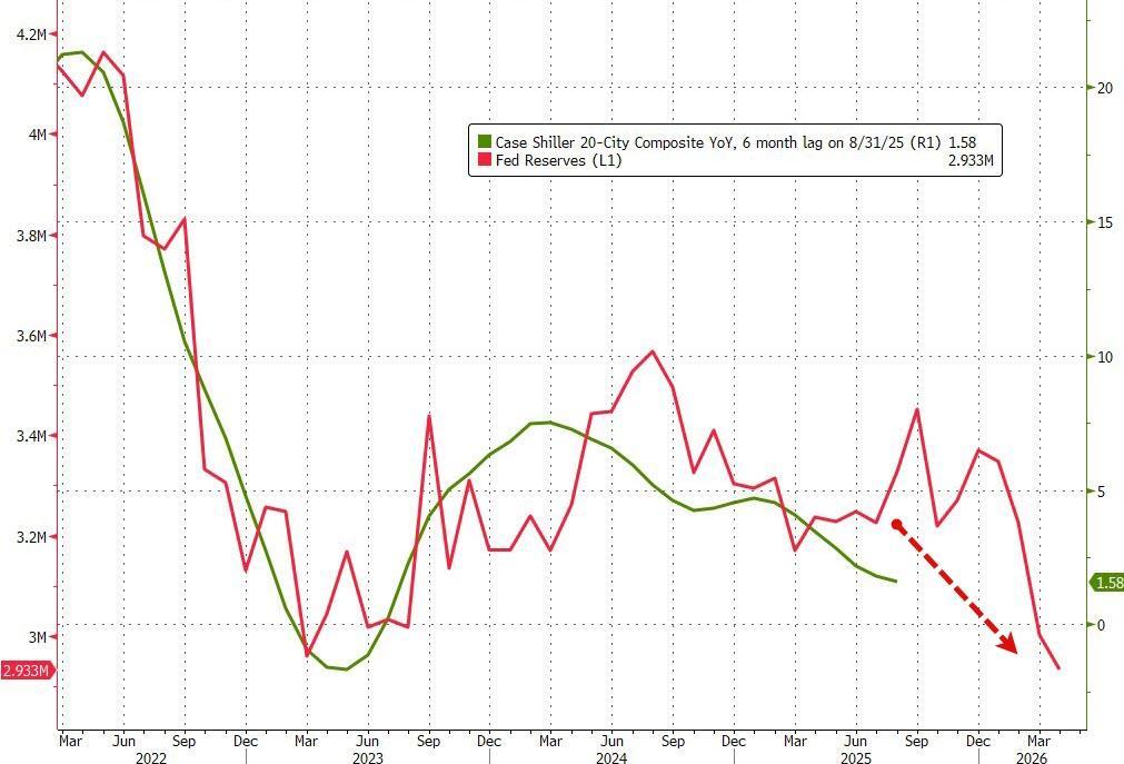 However, home-price changes do seem to track very closely with bank reserves at The Fed (6mo lag)...