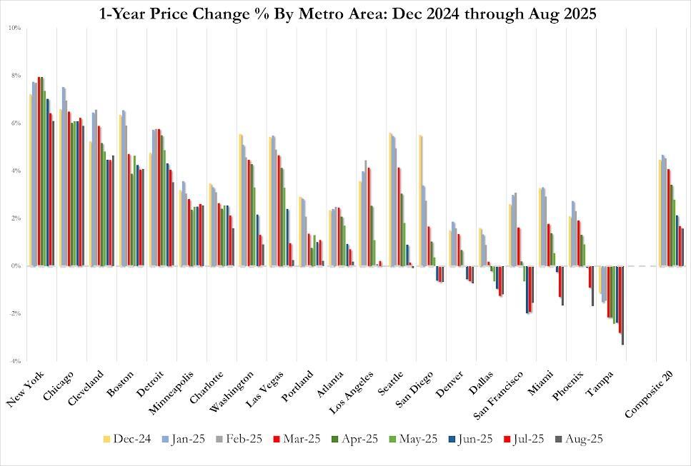 Prices fell on a YoY basis in 8 cities (including LA, San Diego, and San Francisco) with Tampa falling 3.3%, the lowest of the 20 cities measured.