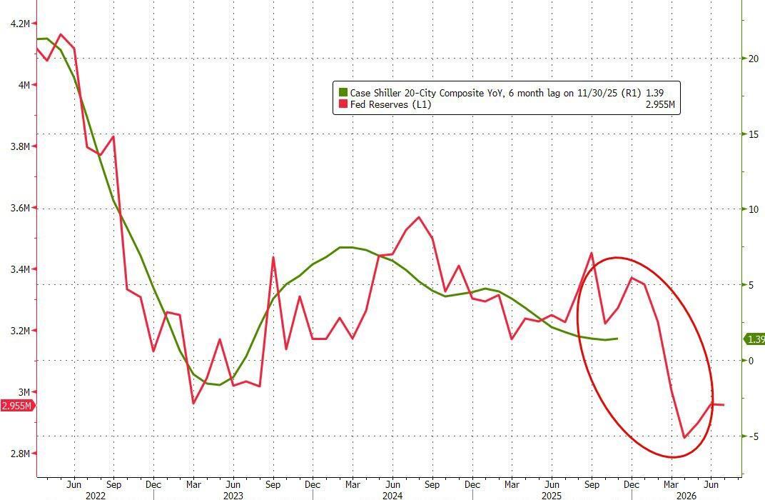 However, home price appreciation does seem to track very closely with bank reserves at The Fed (6mo lag), which implies prices are going continue to lag for the next few months...