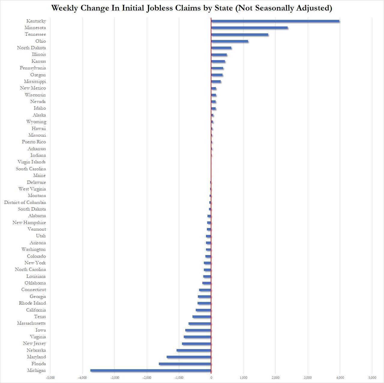 A breakdown of weekly claims changes finds the biggest increases in Kentucky and Minnesota, and the biggest drops in Michigan and Florida.