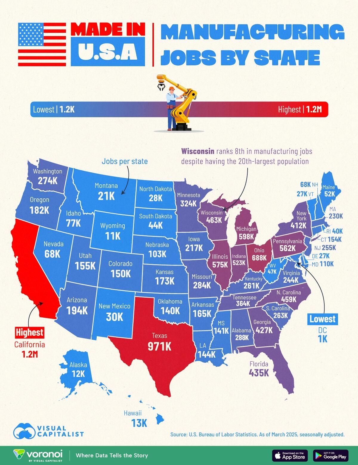 Based on April 2025 data from the Bureau of Labor Statistics, this map, via Visual Capitalist's Bruno Venditti, highlights the U.S. states leading and lagging in manufacturing employment.
