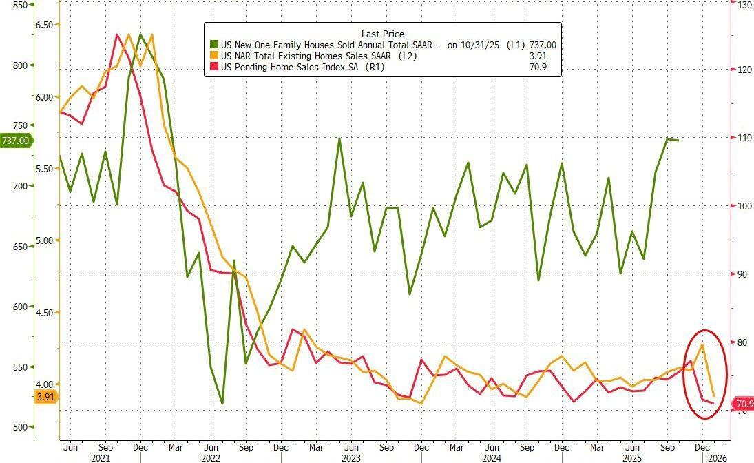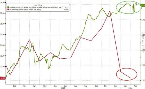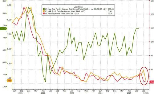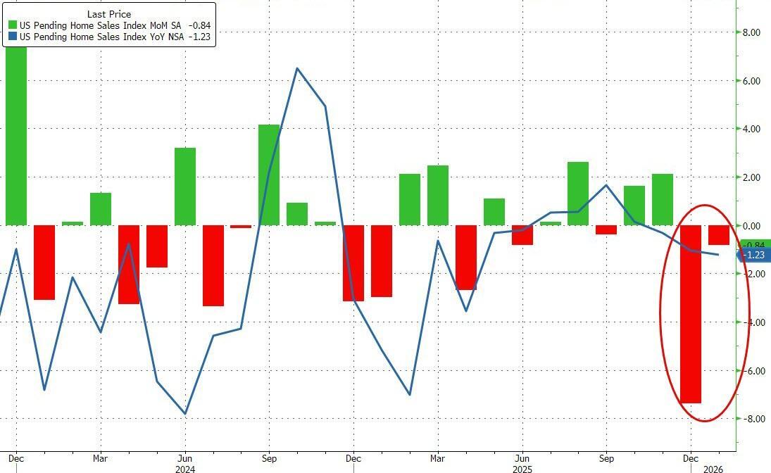 After plunging in December (biggest drop since COVID), US Pending Home Sales disappointed once again with a modest 0.8% MoM decline in January (+2.0% MoM exp). This left sales down 1.23% YoY...