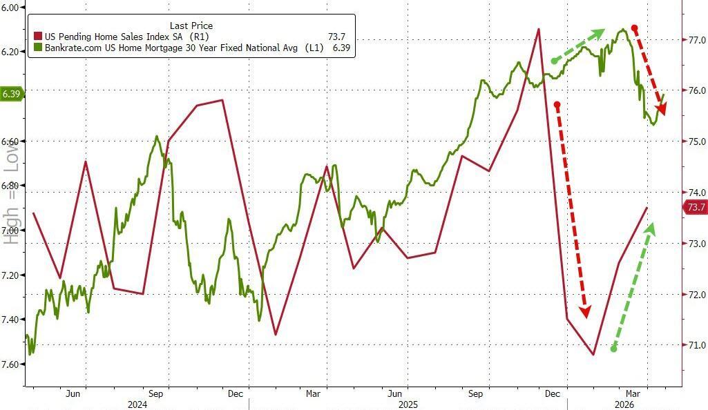While mortgage rates did pick up at the start of March (Iran War), pending home sales have been disconnected from improving 'affordability' in recent months...