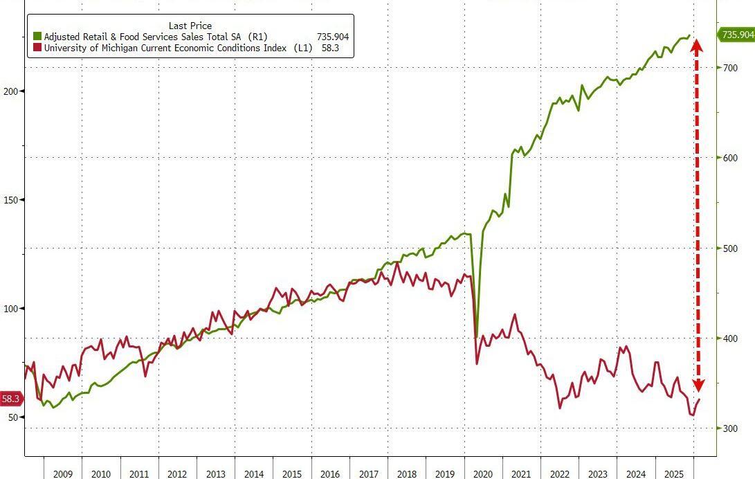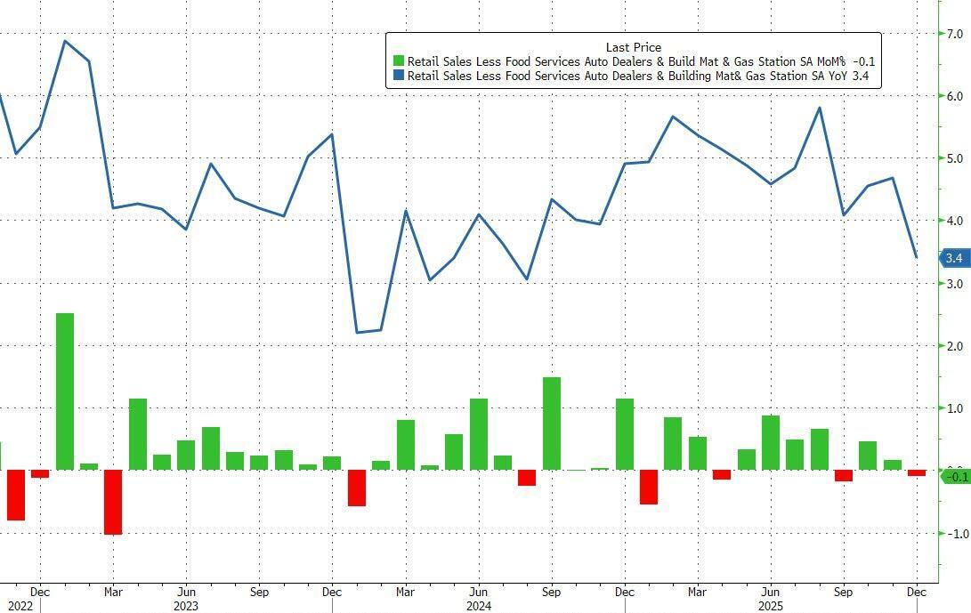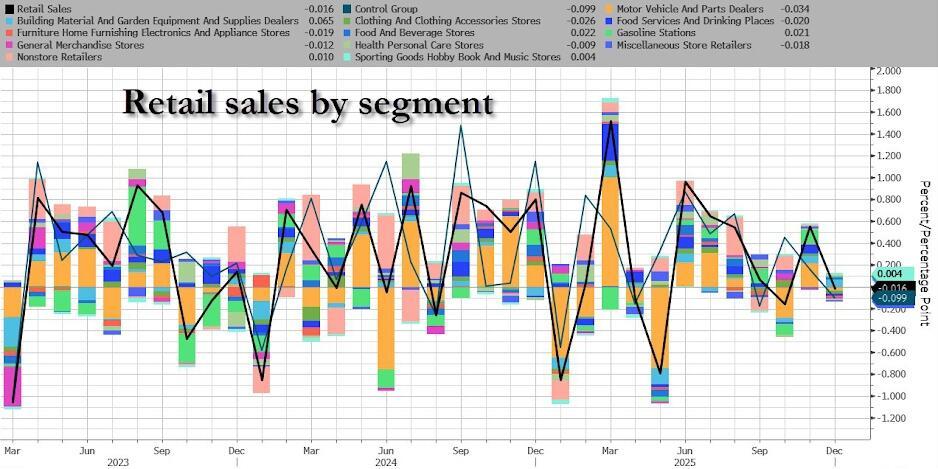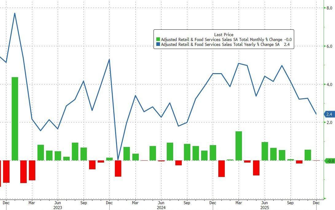 After a big bounce in November, expectations were for a decent 0.4% MoM rise in retail sales to end the year (despite the plunge in consumer confidence signaled by UMich), but the actual print was a big disappointment with headline retail sales unchanged MoM in December. That is the weakest YoY retail sales growth since Sept 2024...
