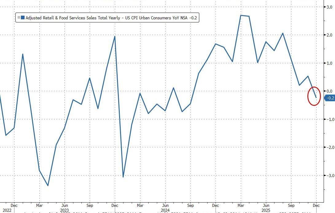 Interestingly, 'real' retail sales (admittedly crudely adjusted via CPI) actually decline on a YoY basis in December...