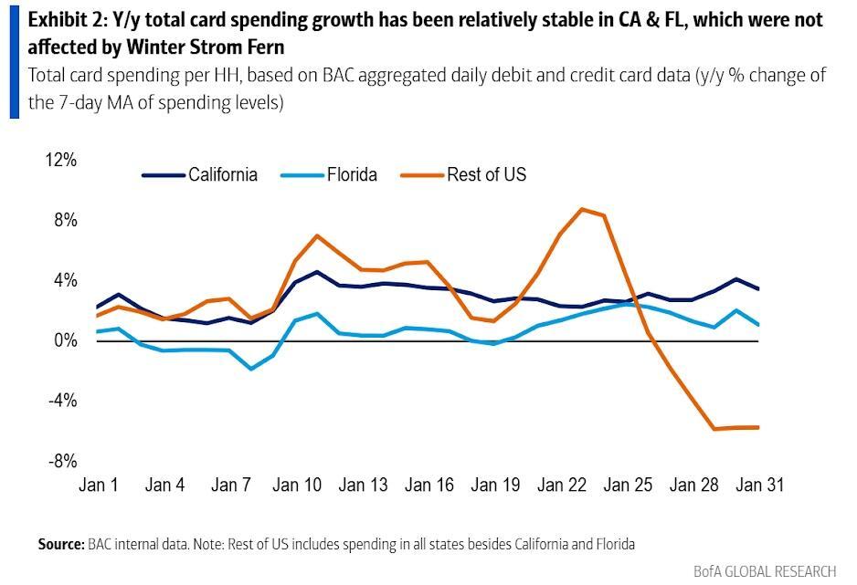 Today's Retail Sales data is for December and so should be 'clean' from the perspective of the January storms which dramatically reduced consumers ability to spend year-to-date, as illustrated by BofA's 'rest of US' spending indicator...
