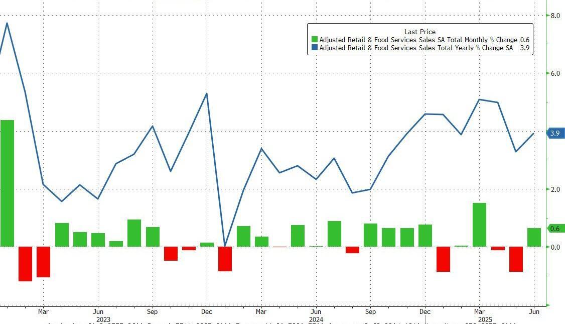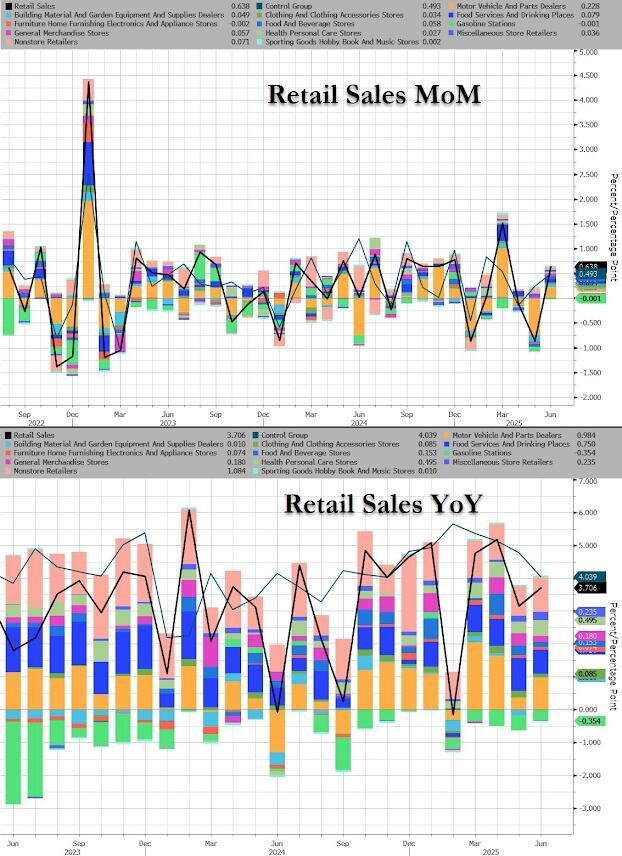 Despite all the dismal downbeat sentiment signals from various 'soft' data, it appears the American consumer is not deterred from spend, spend, spend as US Retail Sales surged 0.6% MoM in June (up from the 0.9% MoM plunge in May and better than the +0.1% MoM expected), driving sales up 3.9% YoY...