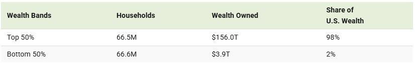 The rich half own about $156 trillion (or about 98% of it). The poorer half only own about $4 trillion.