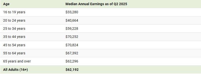 As seen in the data table below, America’s youngest workers (aged 16 to 19) earn the least, with annual earnings of just $33,280. This figure is almost half the national median, reflecting their limited experience and lower-paying entry-level roles.