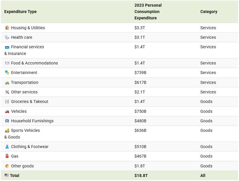 But how much do Americans collectively spend on the goods and services they need? And what items draw the largest share?
