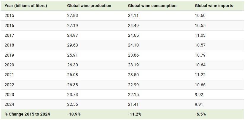 While production has fallen sharply, global wine consumption has declined at a slower pace. Total consumption dropped from about 24.1 billion liters in 2015 to 21.4 billion liters in 2024, a decline of roughly 11%.