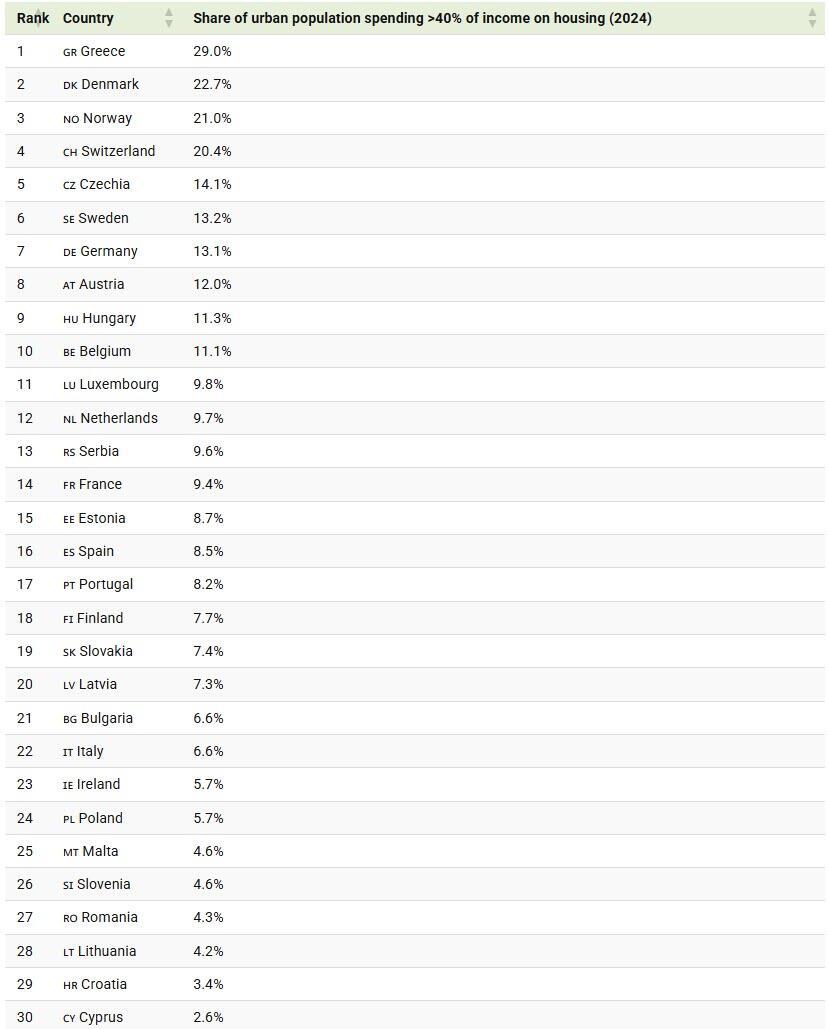 In the table below, we rank EU countries by the share of the population that pays more than 40% of household income, net of tax and pension contributions, on housing: