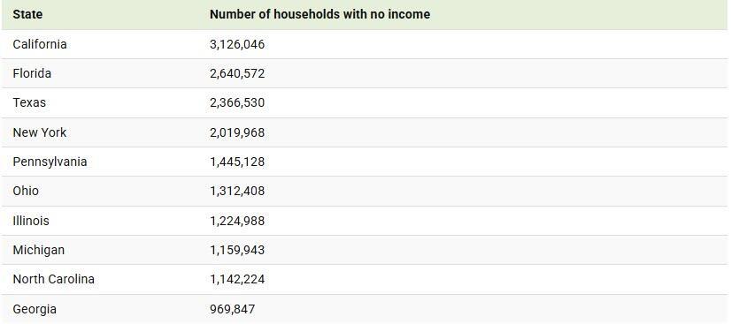 Below we look at the top 10 states by number of households with no income: