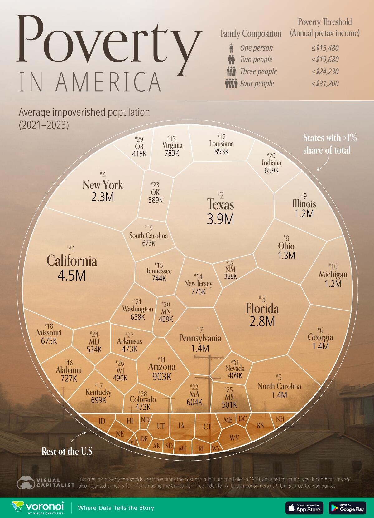 In this chart Visual Capitalist's Pallavi Rao breaks down where the poor in America actually live, ranked by each state.