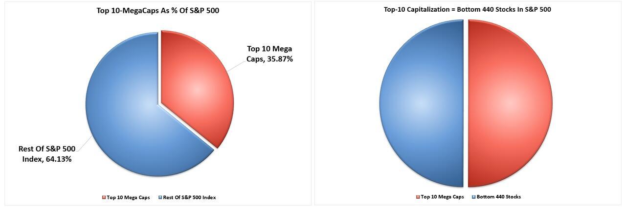 As noted in “The Bull Market Is Alive And Well,” the top 10 stocks have a hefty weighting in the S&P 500 index, which absorbs $0.36 of every dollar invested. Furthermore, the top 10 stocks impact the S&P 500 index the same as the bottom 440 stocks combined.