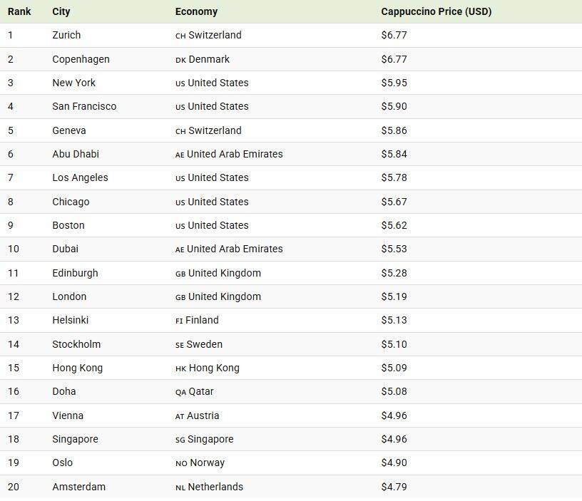 Zurich and Copenhagen share the top spot, with an average cappuccino price of $6.77. Switzerland’s high wages and cost of living, combined with a strong currency, push everyday purchases higher.