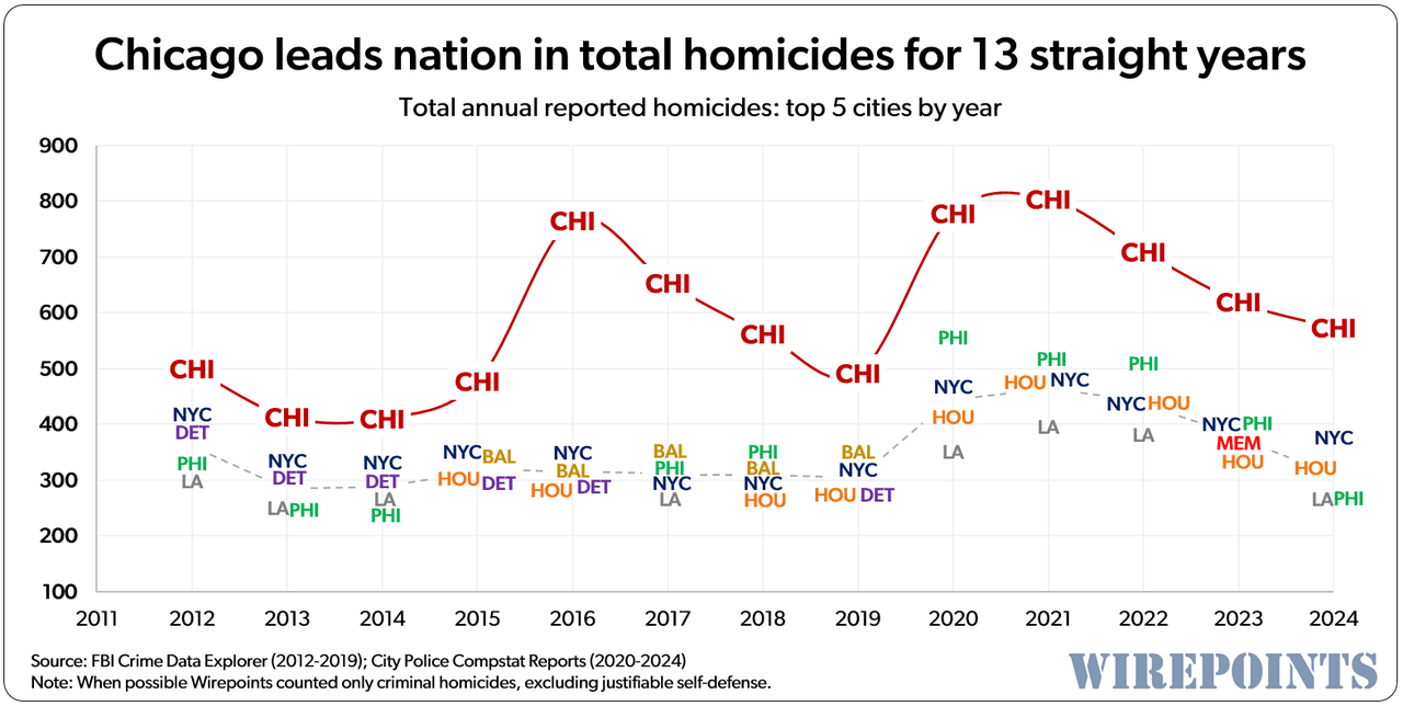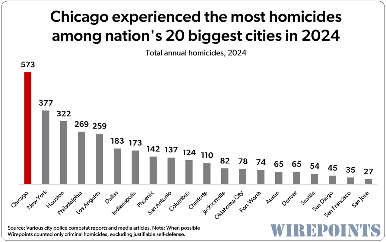 The data compiled by Wirepoints is based on 2024 homicide totals for the nation’s 75 biggest cities, assembled via year-end city police compstat reports, various news articles and other sources.