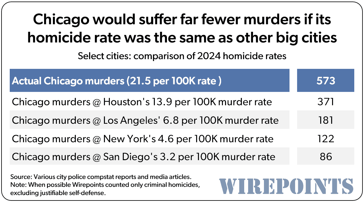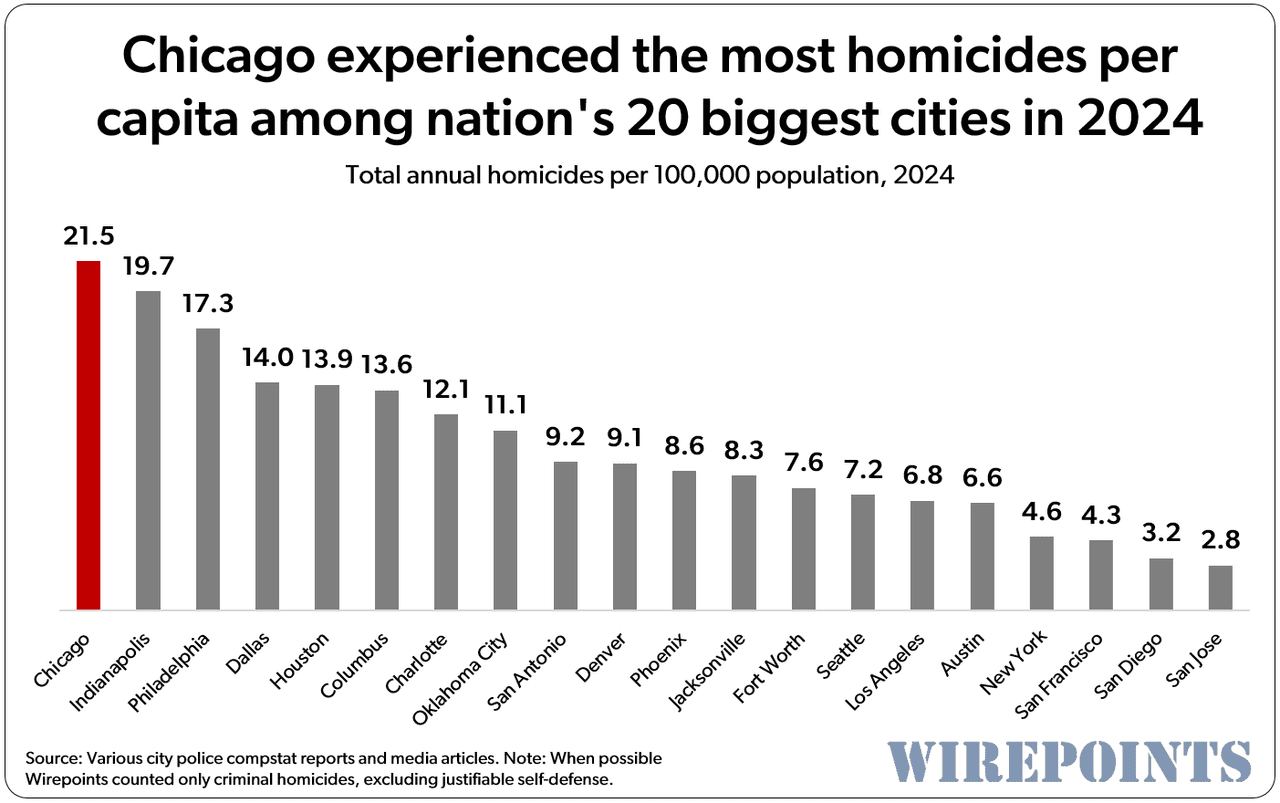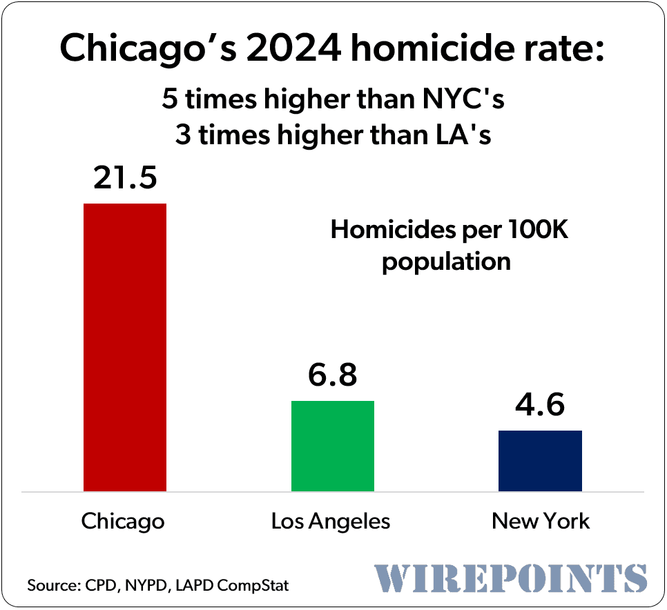 Chicago’s murder rate of 21.5 per 100,000 population was 3 times that of Los Angeles and nearly 5 times higher than New York’s. That’s a staggering difference.