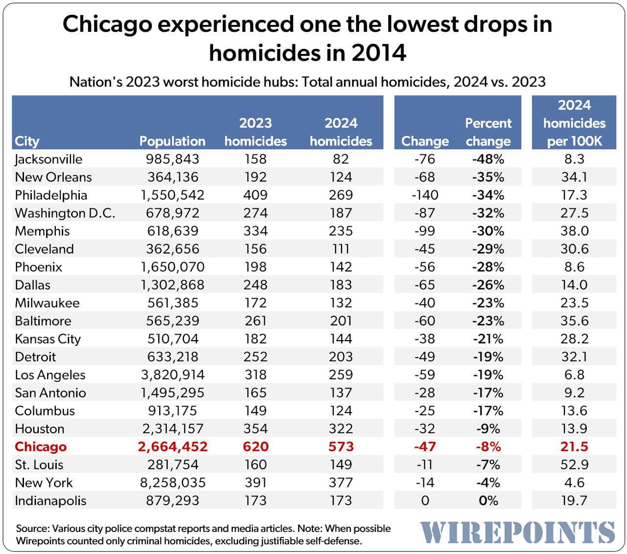 St. Louis experienced a small decline of just 7% – leaving it as the nation’s homicide-per-capita capital for the third year in a row. And Chicago’s 8% decline – 573 murders in 2024 versus 620 in 2023 – was the 4th-lowest among the top 20.