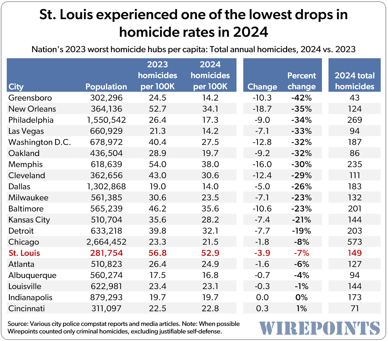 On the flip side, the nation’s per-capita homicide capital St. Louis saw a murder rate drop of just 8%, the nation’s 6th-worst decline out of the top 20 most-murderous cities.