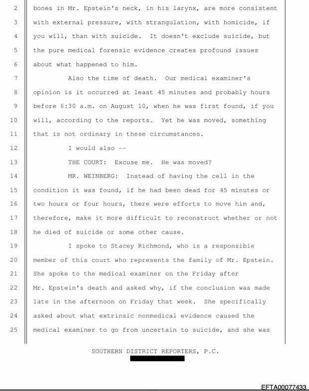 Attorneys for Jeffrey Epstein told the Southern District of New York: “We also had been in receipt of a tremendous amount of medical and scientific evidence volunteered to us opining that the injuries suffered, as reported, were far more consistent with assault than with suicide, and we are happy to supply the court with all the information we have.” These attorneys also noted how the prison guards had moved the body, complicating investigation efforts: “Instead of having the cell in the condition it was found, if he had been dead for 45 minutes or two hours or four hours, there were efforts to move him and, therefore, make it more difficult to reconstruct whether or not he died of suicide or some other cause.”