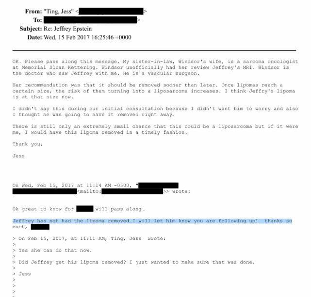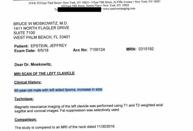 Jeffrey Epstein suffered from a roughly 6 cm lipoma (fatty tumor) in his left supraclavicular fossa — the area above his left collarbone — documented in 2016, 2017, and again in 2018. The 2016 report also references a similar exam from 2014. In 2016 there were communications about surgical removal. In 2017, Epstein’s assistant confirms he hasn’t had it removed. In 2018, it’s being MRI’d all over again.