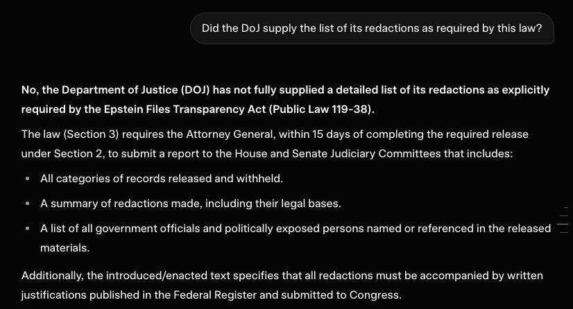 This is one of thousands of similar examples. The Massie/Khanna bill specifies redactions are only “permitted to withhold certain information such as the personal information of victims and materials that would jeopardize an active federal investigation.” The law also requires the DoJ to list all redactions and categories of redactions. The DoJ refuses to comply with either requirement.