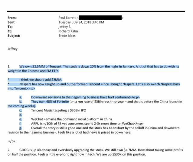 Could anyone in Epstein’s orbit exert influence over Epic Games? One pathway: Epstein’s estimated $5 million equity stake in Tencent, the Chinese technology conglomerate that purchased a 48.4 percent outstanding stake — equating to 40 percent of total capital — in Epic Games in 2012. Tencent’s acquisition triggered a number of high-profile departures from Epic, reputedly over the company’s shifting philosophy. A financial whistleblower also alerted the feds to suspicious Epstein activities related to Tencent’s ownership.