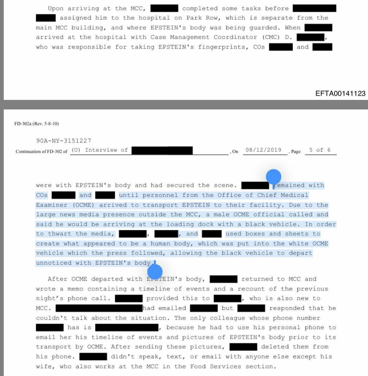 “[REDACTED] remained with COs [REDACTED] and [REDACTED] until personnel from the Office of Chief Medical Examiner (OCME) arrived to transport EPSTEIN to their facility. Due to the large news media presence outside the MCC, a male OCHE official called and said he would be arriving at the loading dock with a black vehicle. In order to thwart the media, [REDACTED], [REDACTED] and [REDACTED] used boxes and sheets to create what appeared to be a human body, which was put into the white OCME vehicle which the press followed, allowing the black vehicle to depart unnoticed with EPSTEIN's body.”