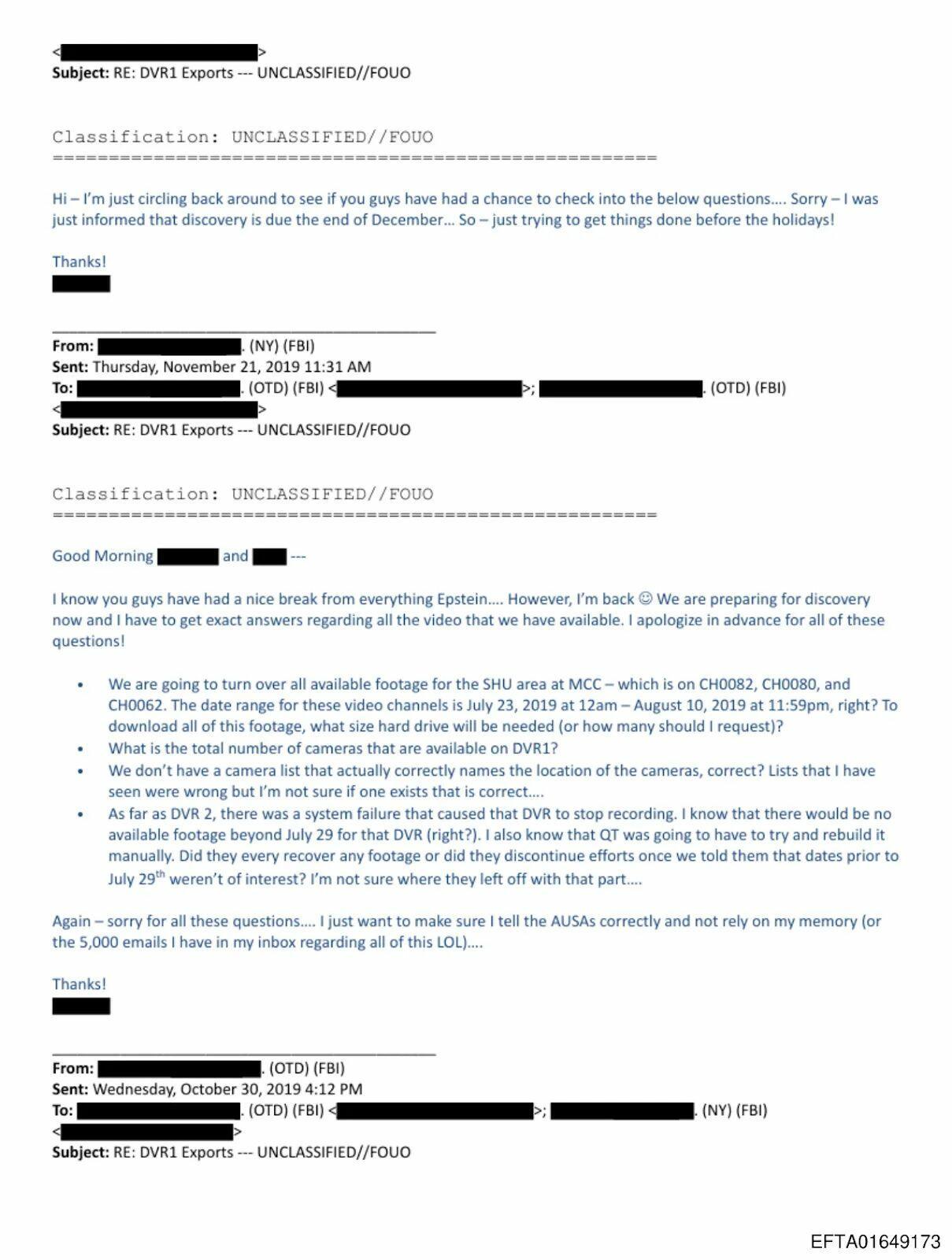 Due to a known issue with the prison’s DVR system — an issue jail officials were already aware of — only one security camera in the SHU unit was functioning. The feds said there exists no camera list correctly naming camera locations in the jail. The corrupted DVR drives were shipped to Quantico, where the FBI reportedly planned to attempt data recovery. However, according to an FBI letter, “they discontinue[d] those efforts once we told them dates prior to July 29th weren’t of interest.” This is itself strange, as pre-July 29th would have covered Epstein’s original reported strangulation.