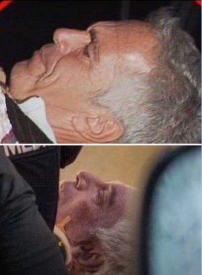 The Epstein in the post-mortem photos has ears and a nose that look markedly different from Epstein’s known features. Morticians have also noted that images of the deceased with his mouth closed do not align with how faces typically present after death by hanging — muscles relax and gravity takes over, meaning mouths and eyes usually fall open.