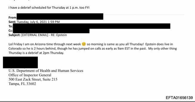 The Epstein files dump also includes emails between DoJ and HHS officials from July 6, 2021 — two years after Epstein’s death — discussing “Epstein’s” availability for a call in Colorado. Snopes investigated and found evidence indicating these emails refer to Richard Epstein, a cooperating witness in a Medicare fraud investigation. Despite my general skepticism of Snopes, I believe they’re correct here: the evidence strongly suggests this email chain referred to a different Epstein.