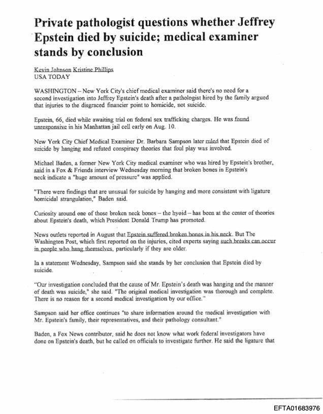 Jeffrey Epstein’s brother hired famed pathologist Michael Baden to observe the autopsy. “Baden served for decades as a member of the New York State Correction Medical Review Board, an entity responsible for reviewing deaths of inmates in custody,” the Miami Herald reports. “Baden has conducted more than 20,000 autopsies including reviewing those of former President John F. Kennedy, and civil rights leaders the Rev. Martin Luther King Jr. and Medgar Evers.”