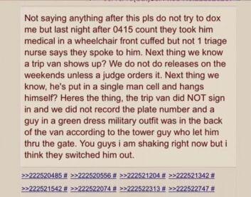 “Last night after 0415 count they took him medical in a wheelchair front cufed but not 1 triage nurse says they spoke to him. Next thing we know a trip van shows up? We do not release weekends unless a judge orders it. Next thing we know, he’s put in a single man cell and hangs himself? Here’s the thing, the trip van did NOT sign in and we did not record the plate number and a guy in a green military outfit was in the back of the van according to the tower guy who let him thru the gate. You guys I am shaking right now but I think they switched him out.”