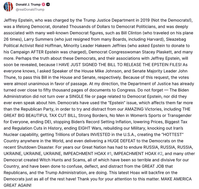 "I HAVE JUST SIGNED THE BILL TO RELEASE THE EPSTEIN FILES!" Trump wrote in a lengthy screed on Truth Social. "As everyone knows, I asked Speaker of the House Mike Johnson, and Senate Majority Leader John Thune, to pass this Bill in the House and Senate, respectively. Because of this request, the votes were almost unanimous in favor of passage.