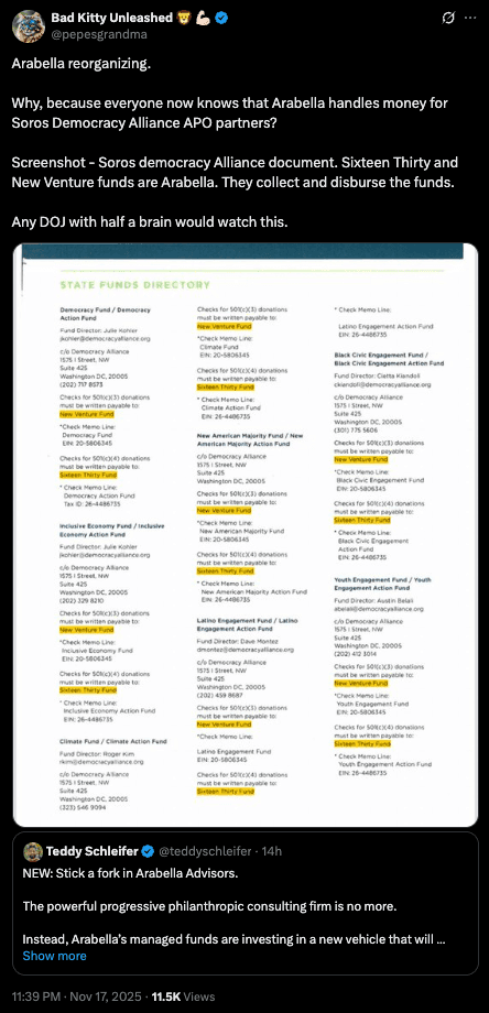 X user Bad Kitty Unleashed noted, "Arabella reorganizing. Why, because everyone now knows that Arabella handles money for Soros Democracy Alliance APO partners? Screenshot - Soros democracy Alliance document. Sixteen Thirty and New Venture funds are Arabella. They collect and disburse the funds. Any DOJ with half a brain would watch this."
