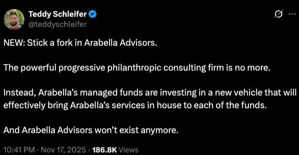 "Stick a fork in Arabella Advisors. The powerful progressive philanthropic consulting firm is no more," New York Times reporter Teddy Schleifer wrote on X, adding, "Instead, Arabella's managed funds are investing in a new vehicle that will effectively bring Arabella's services in house to each of the funds. And Arabella Advisors won't exist anymore."