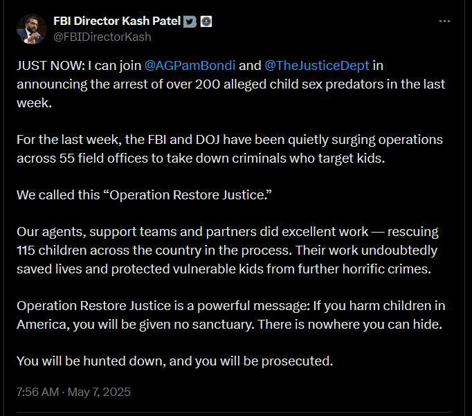 "For the last week, the FBI and DOJ have been quietly surging operations across 55 field offices to take down criminals who target kids," Patel posted on X.