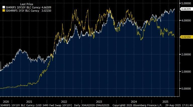 ...and this is starting to play out in market pricing…1y1y USD forward swaps are 3.02%, priced for a return of policy rates back to what most consider neutral…something I would consider to be a dovish outcome, given the current backdrop for the US economy (unless the labour market collapses in coming months)…and yet 10y10y forward swaps have risen to 4.66%, the highest in over a decade (chart below).