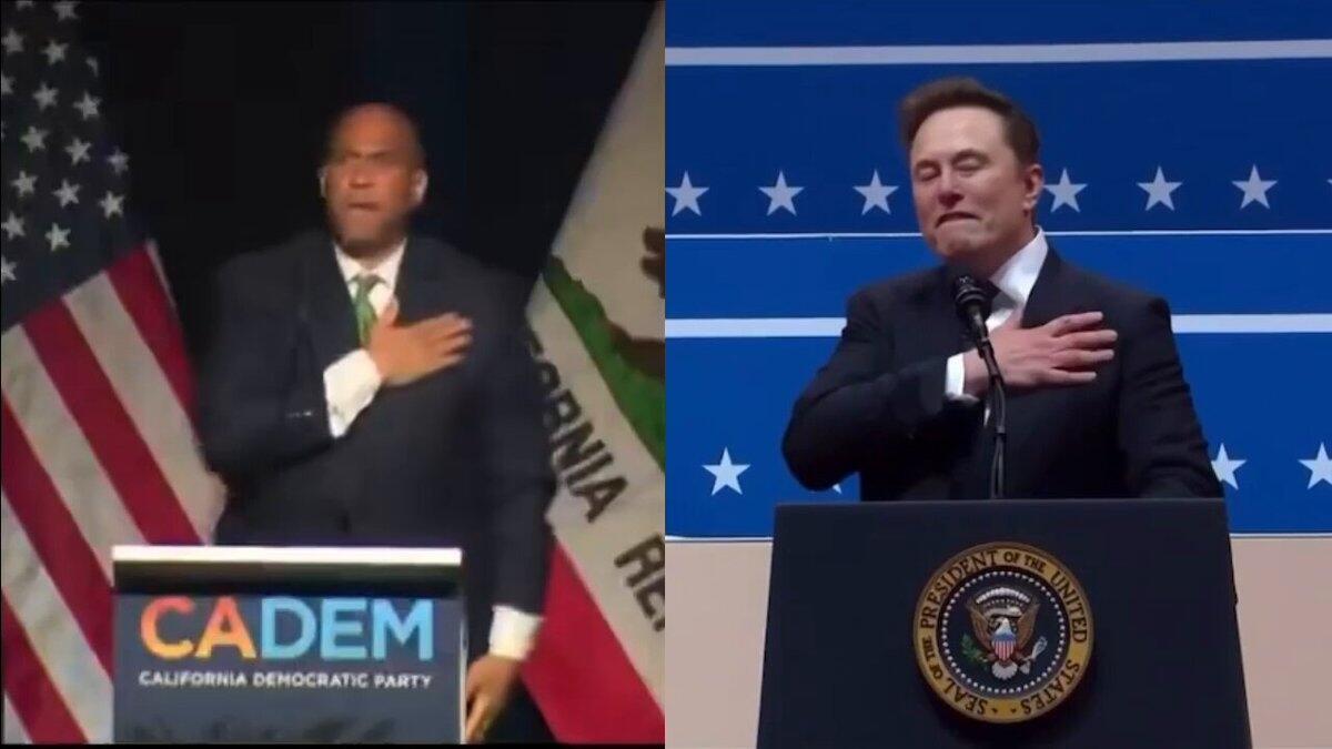 Booker ended a speech at the the California Democratic Party Convention by tapping his heart and then pushing his arm out to the crowd, exactly the way Elon did after President Trump’s victory.