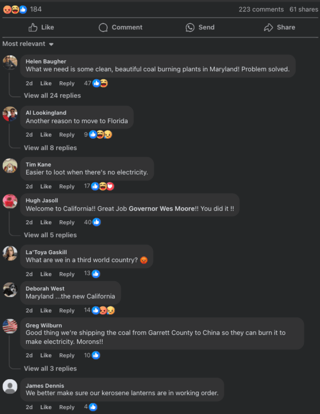 To capture the growing discontent among Maryland residents, we're turning to the comment section of The Baltimore Sun's Facebook post featuring the article.
