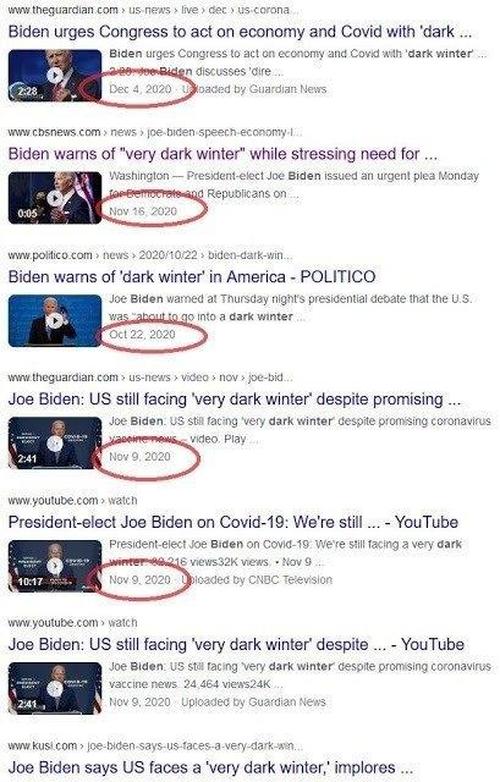 Biden’s handlers have had him fear mongering with the “Dark Winter” jargon since October, as their plan was to not pass a relief bill for poverty stricken unemployed workers and small businesses; ramp up testing to extraordinary levels using a PCR test guaranteed to produce millions of false positives; and classify the deaths of thousands of very old people as Covid deaths, no matter what they really died from; all to seize power over the government.