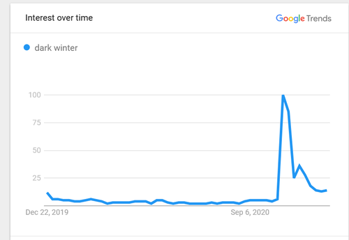 You can even use their own technology to prove their duplicitous intentions. Google Trends reveals the phrase “Dark Winter” was virtually non-existent until October 2020. The Deep State public relations leeches running Biden’s campaign did some psychological testing on potential propaganda victims and found having Biden, his minions, and co-conspiratorial media utter this phrase thousands of times per day would invoke enough fear to convince the plebs to stay locked down, masked up, and pleading for the vaccine.